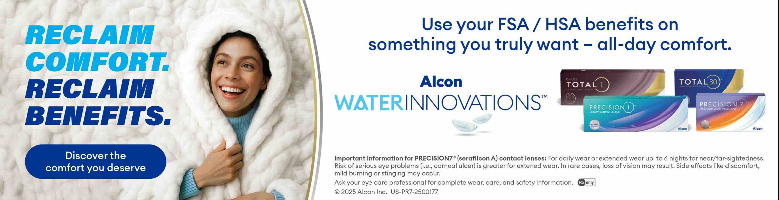 With a microthin layer of moisture that is over 80% water, you’ll experience improved comfort and better hydration to support a stable tear film, so your vision remains precise. Class 1 UV Blocking helps to protect your eyes year-round from the sun, and with daily disposable contact lenses there is no need to worry about storage or cleaning. Precision1® lenses are easy to wear and easy to love.